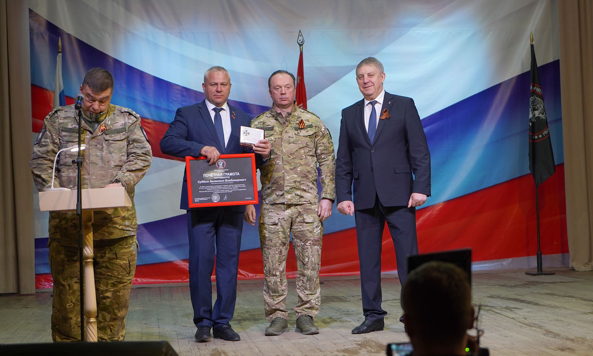 За активную помощь добровольческому формированию Сергей Антошин вручил главе региона Александру Богомазу и председателю Брянской областной Думы Валентину Субботу Почетный знак Брянской области «За отличие в службе» и Почетную грамоту добровольческой бригады «БАРС-Брянск». Аналогичных наград удостоены также сотрудники госорганов и силовых структур, поддерживающие деятельность добровольческого подразделения, а также бойцы, отличившиеся при выполнении поставленных задач.