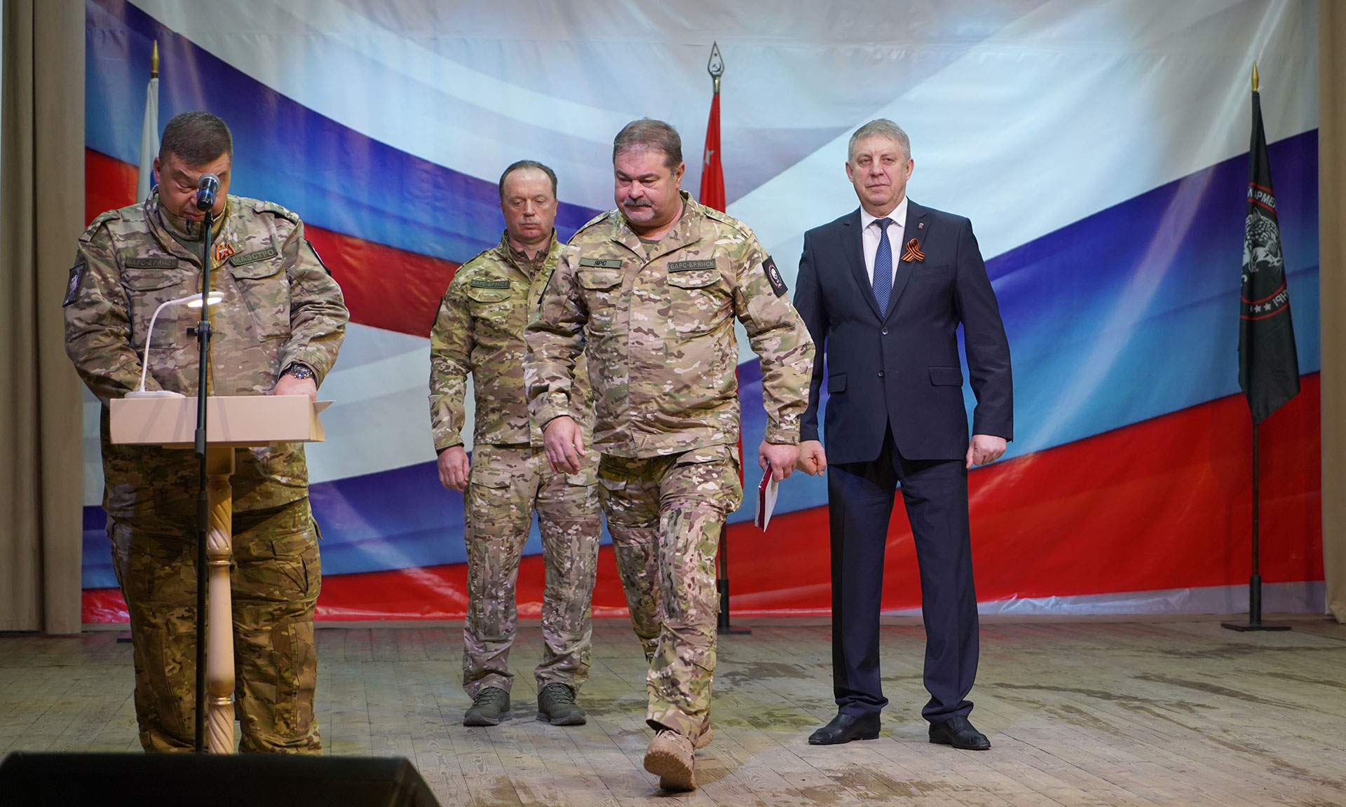 — Буквально два дня назад у нас был заместитель Министра обороны РФ Юнус-Бек Баматгиреевич Евкуров. Он посмотрел, как наши бойцы несут службу, и дал высокую оценку: наша бригада сегодня не только самая большая по численности, но и самая боеспособная. За это огромное спасибо командиру бригады БАРС-Брянск Сергею Сергеевичу Антошину, начальнику штаба Николаю Ивановичу Голубокому.