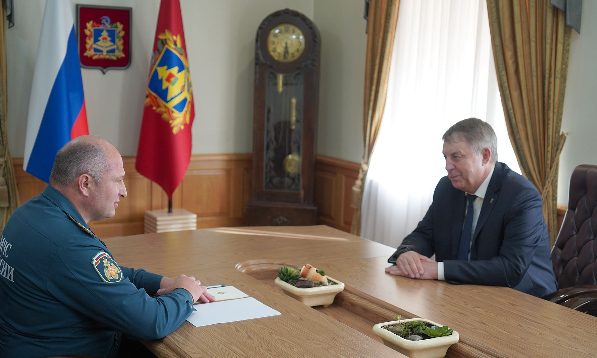 Состоялась рабочая встреча Министра РФ по делам гражданской обороны, чрезвычайным ситуациям и ликвидации последствий стихийных бедствий Александра Куренкова и Губернатора Брянской области Александра Богомаза.