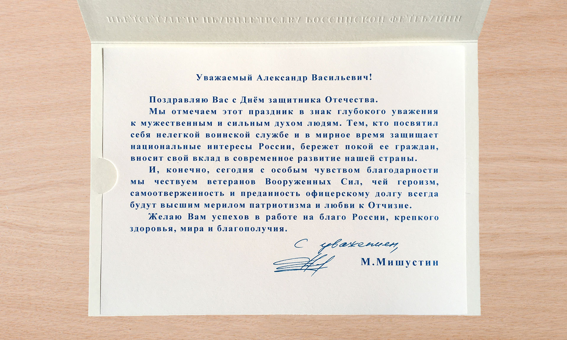 Желаю Вам успехов в работе на благо России, крепкого здоровья, мира и благополучия».