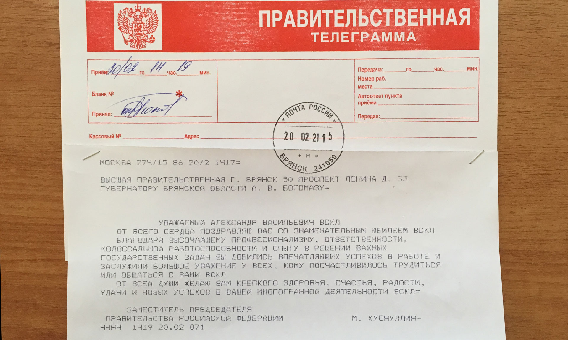 Заместитель Председателя Правительства Российской Федерации Марат Хуснуллин поздравил Губернатора Брянской области Александра Богомаза с юбилеем. В поздравительной телеграмме, в частности, говорится: