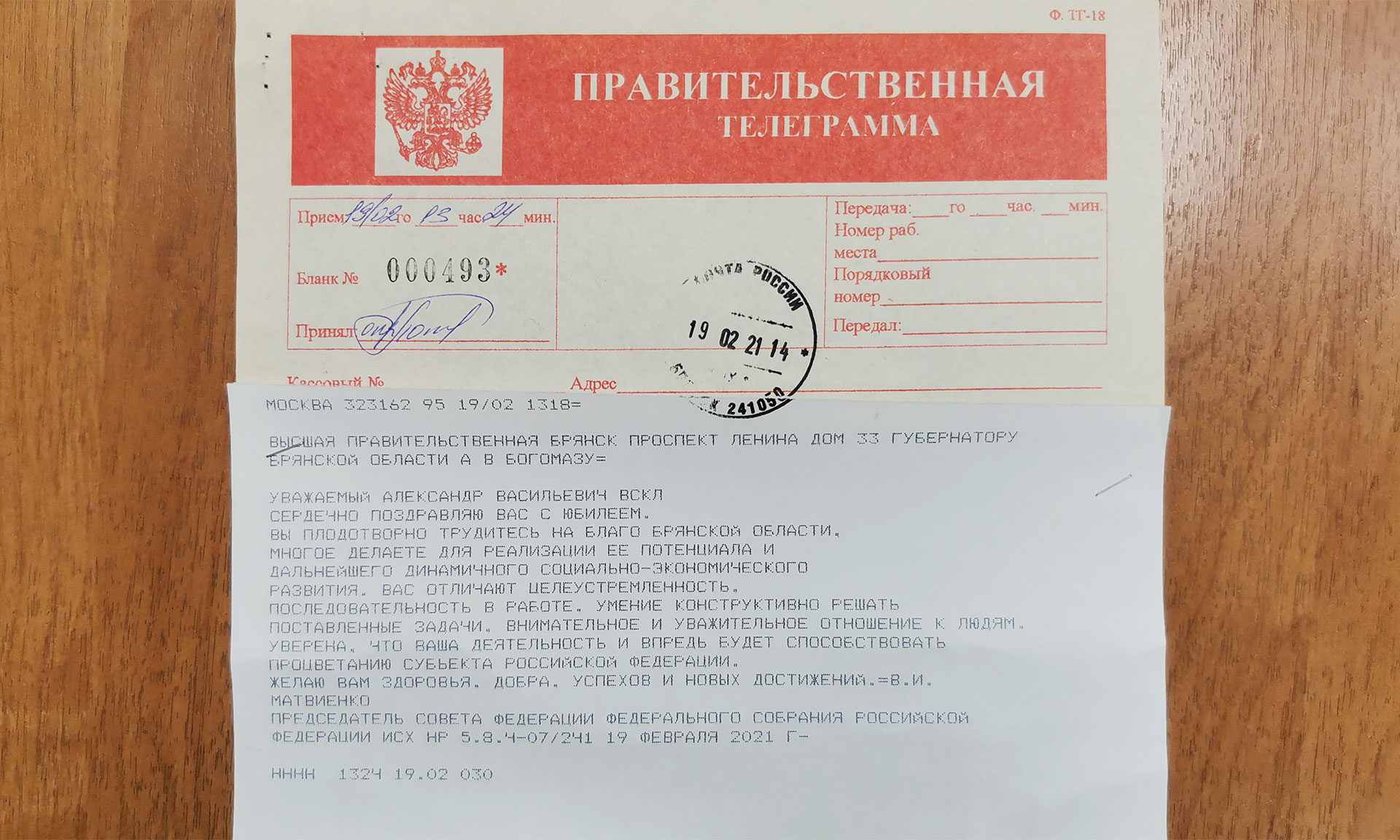 В адрес Губернатора Александра Богомаза поступило поздравление с Днем рождения от Председателя Совета Федерации ФС РФ Валентины Матвиенко. В поздравлении, в частности, говорится: